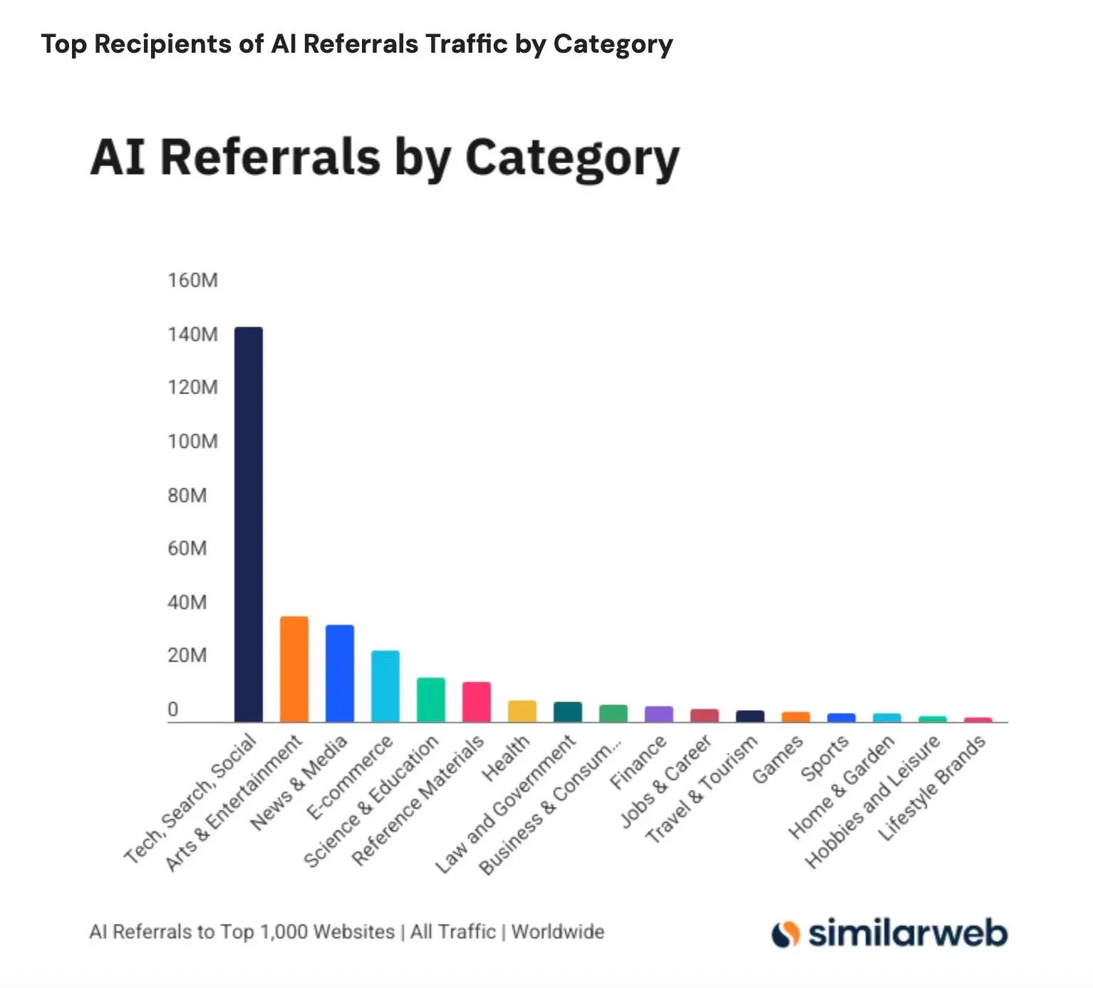 ChatGPT alone accounts for more than 80% of all AI referrals to major websites. And some verticals are already feeling the impact. News and media sites, for example, saw a 770% jump in AI-driven traffic since June 2024.