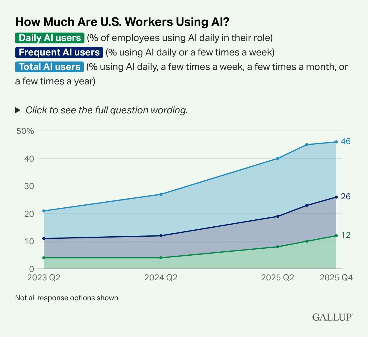 The share of people using AI hasn’t jumped. Frequency has. Daily use moved to 12%. Weekly use reached 26%. And about half of workers still don’t use it at all. That mix matters. Adoption grows slowly. Habits form faster.