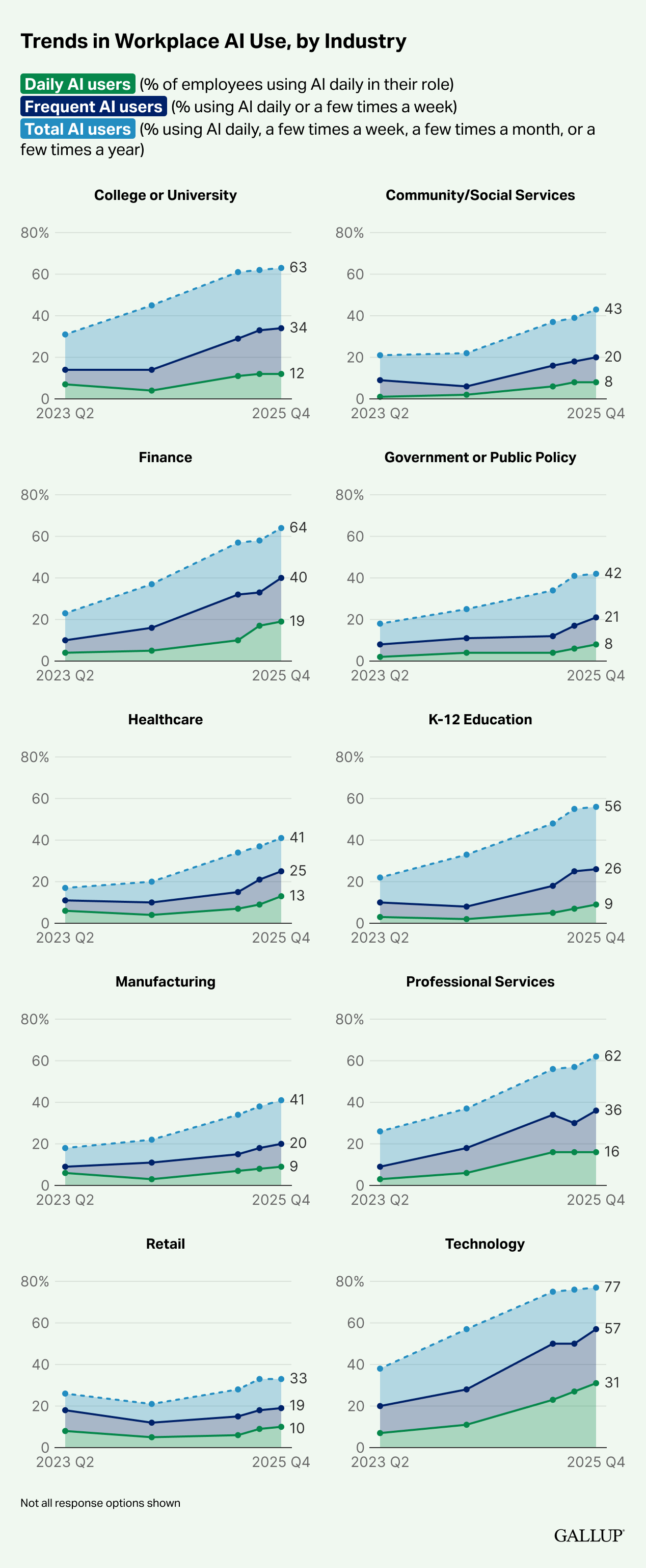 Where people already use these tools, they’re using them more often. Knowledge-heavy work leads the way. Technology, finance, professional services, and higher education keep pulling ahead because the work already lives in documents, dashboards, and decisions. People don’t have to invent reasons to use AI there. It fits.