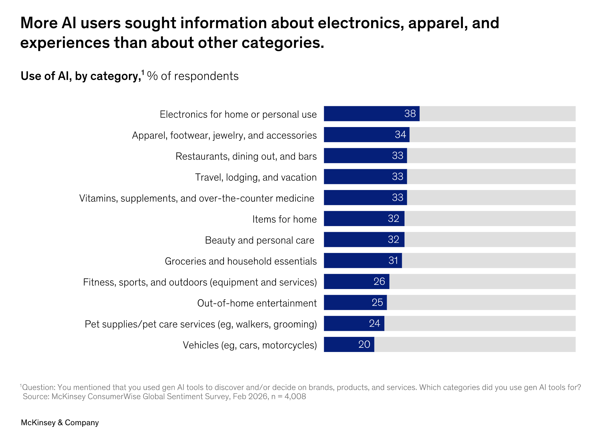 Vehicles already appear inside that behavior pattern. Roughly 20% of consumers say they use AI when researching vehicle purchases, which places auto behind categories like electronics (38%) and apparel (34%) but still firmly inside the AI-assisted decision funnel.